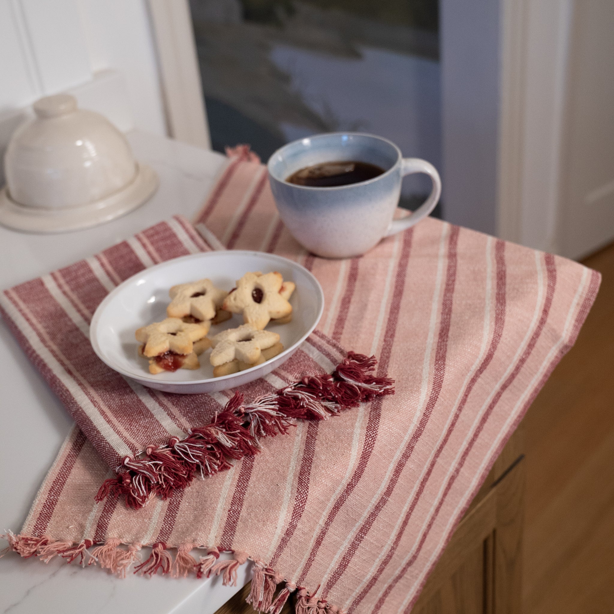 A set of woven stripe organic cotton kitchen towels in pink and burgundy tones. Made with soft, textured organic cotton in a vintage-inspired stripe pattern with tassels on the top and bottom edges. Perfect for all your kitchen needs. This set includes 2 towels.