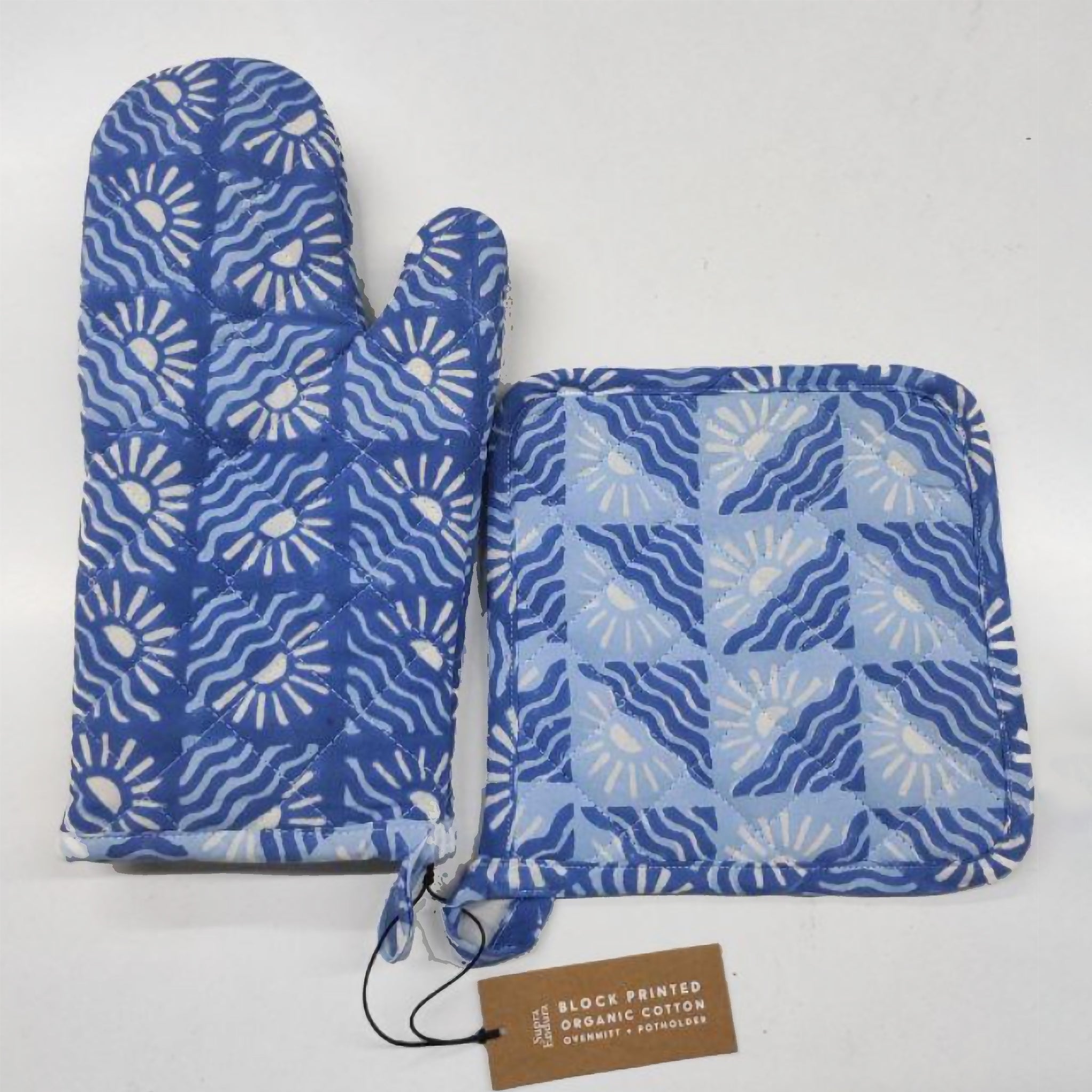 Hand Block Printed Oven Mitt and Pot Holder Set – Blue Sunset